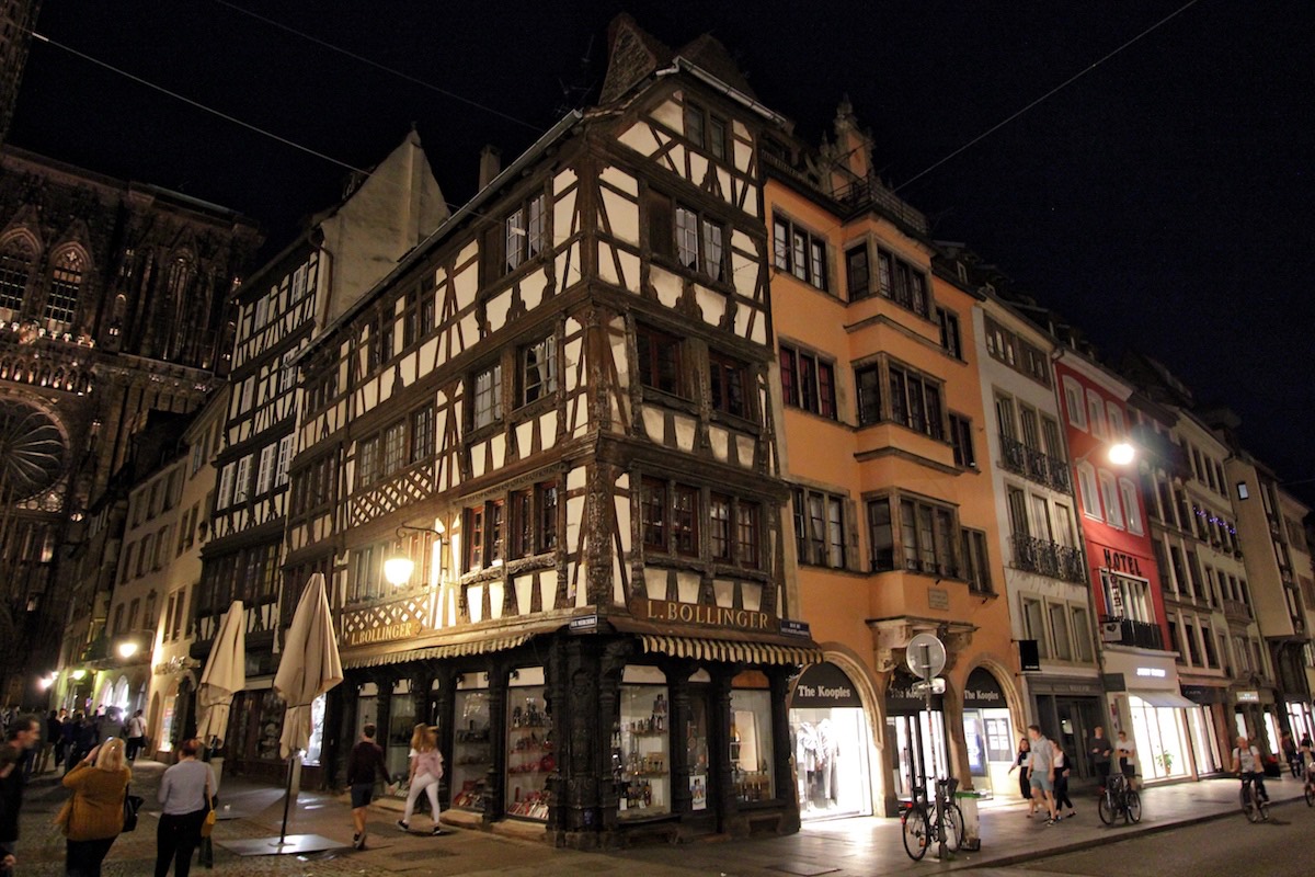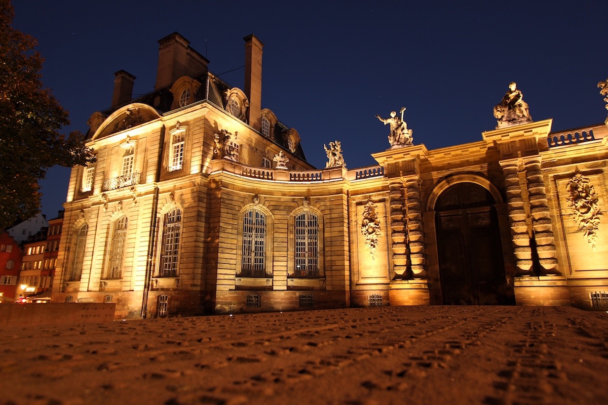 Когда мы вернулись к собору, он уже был подсвечен искусственными огнями. Ещё более завораживающе выглядел дворец Рогана. Две статуи над его воротами символизируют религию и милосердие, такие забытые в нашем мире ценности.