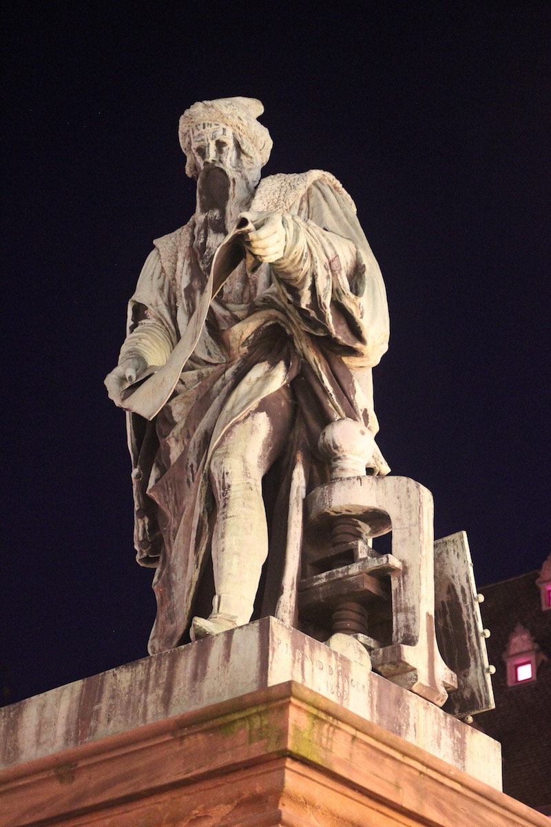 Памятник Иоганну Гутенбергу, который начал свои опыты по книгопечатанию в Страсбурге, был изготовлен Давидом Анжерским, одним из самых востребованных французских скульпторов первой половины 19-го века.