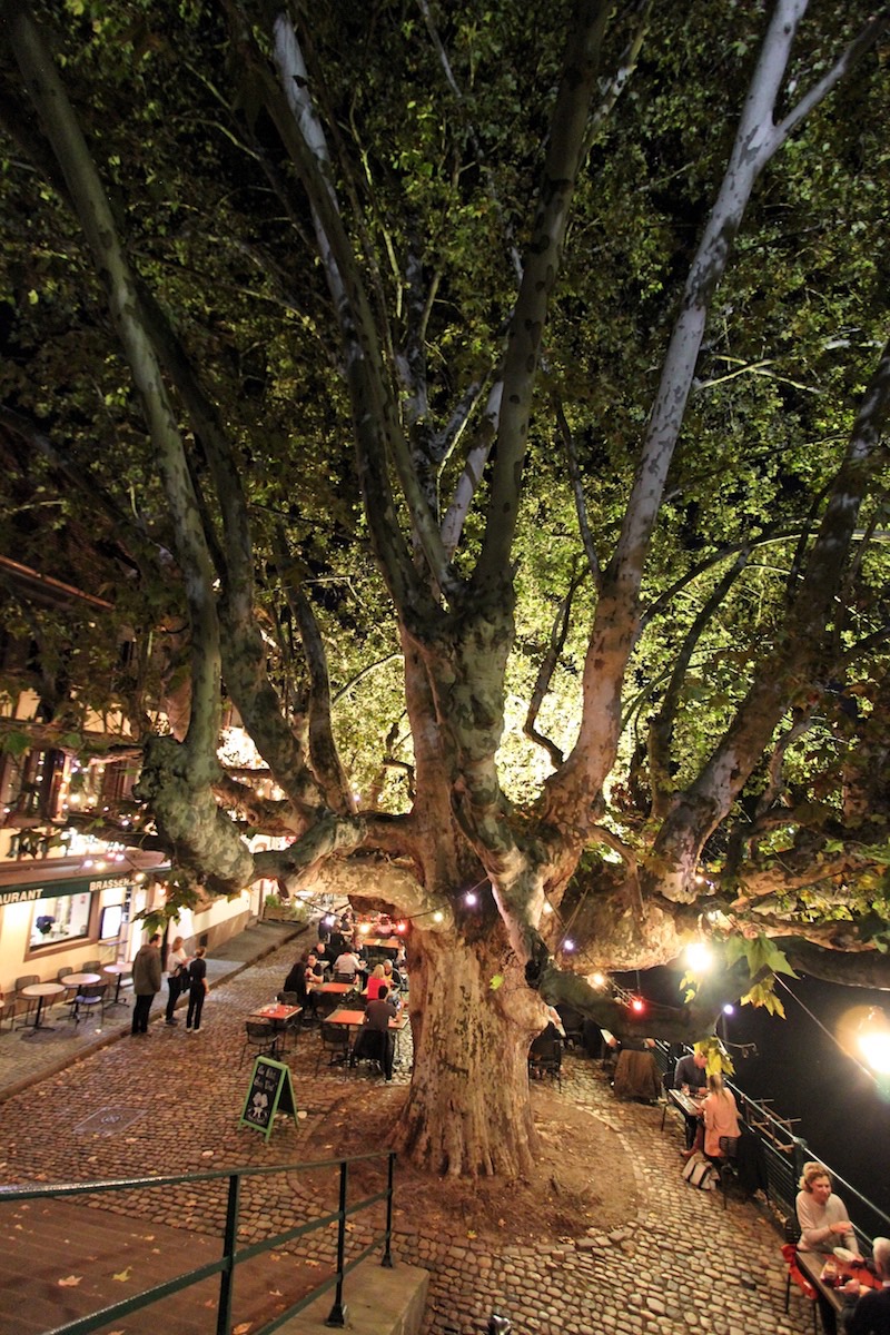 Табличка на мосту привлекла наше внимание к одному из старожилов Страсбурга — гигантскому платану, который был посажен на набережной в 1667 году. Высота дерева 31 м, а окружность ствола — 450 см.