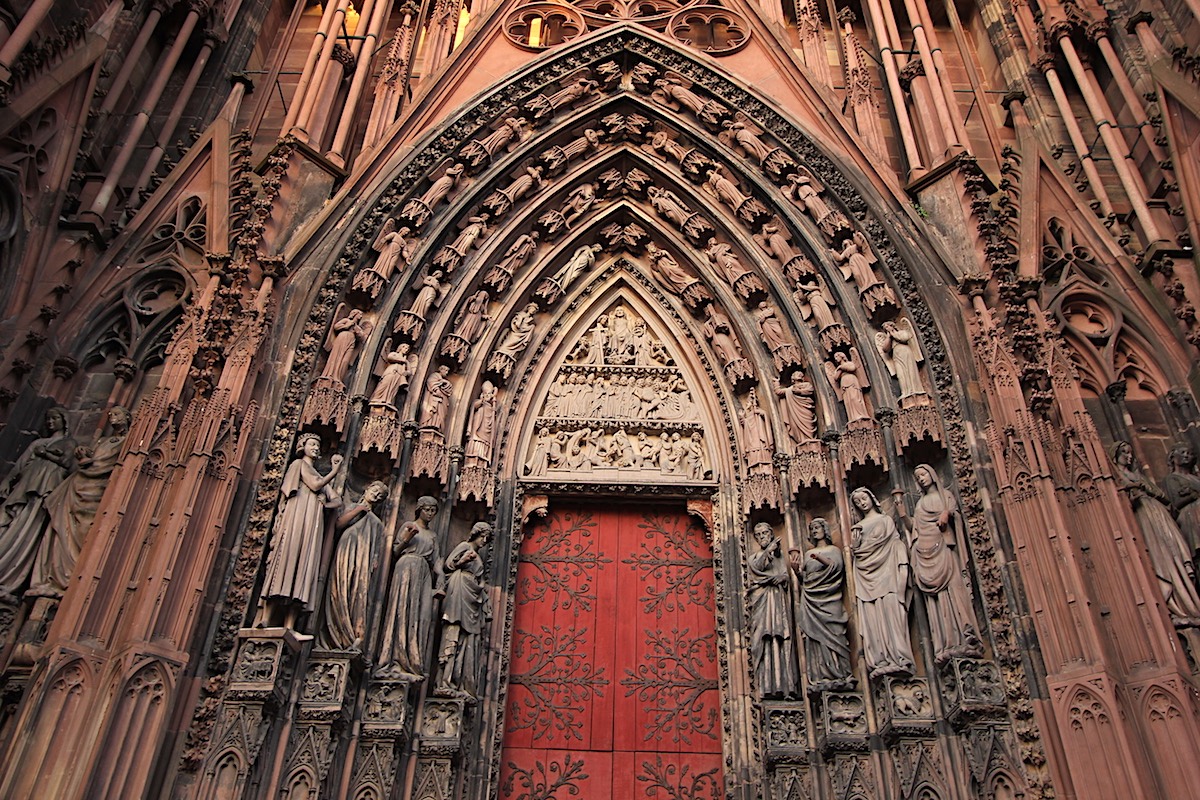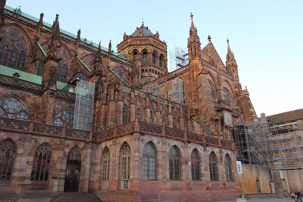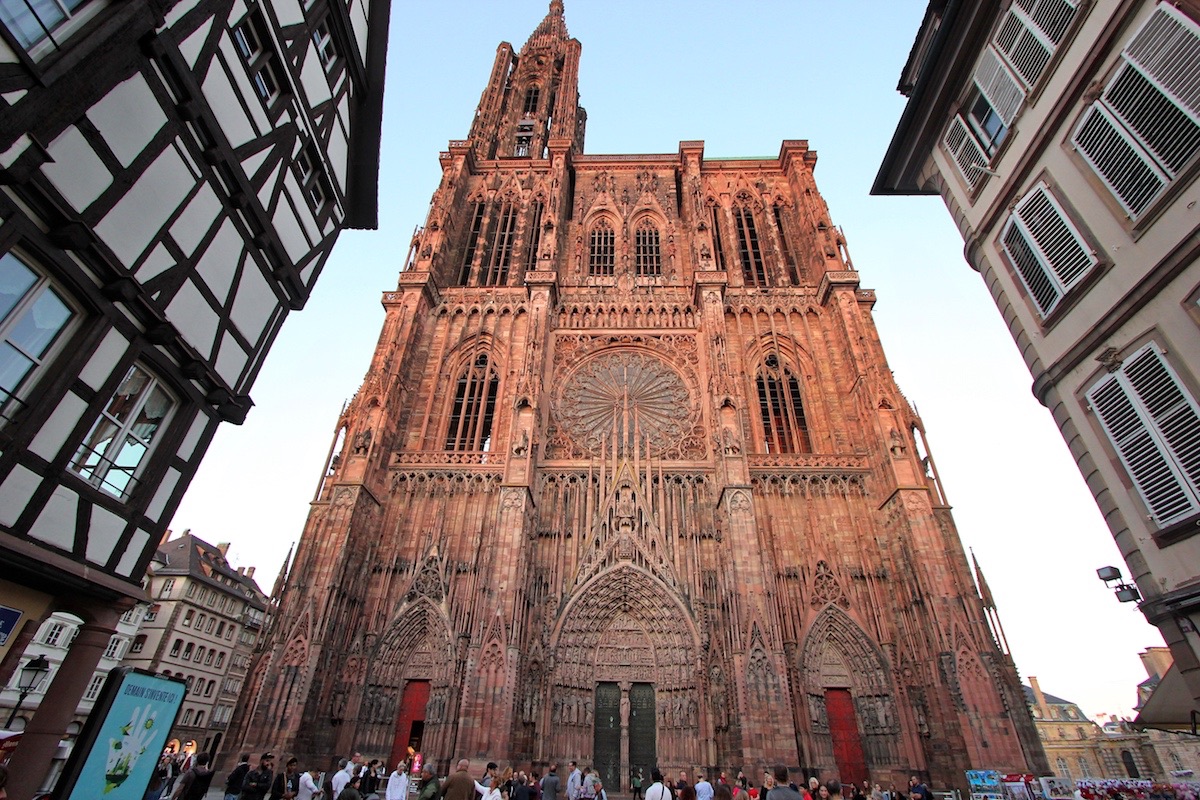На столицу Эльзаса медленно опускался бархатный осенний вечер. На улицах и площадях всё ещё было оживлённо, но пятничная суета уже уступала место беседам за столиками кафе или окнами ресторанов. В мягком свете фонарей старинные фасады сбрасывали пёстрые покрывала и обнажали что-то волнующее, отрадное, знакомое с самого детства. И только собор, будто стыдясь своих огромных размеров, стоял весь залитый краской цвета красной охры.