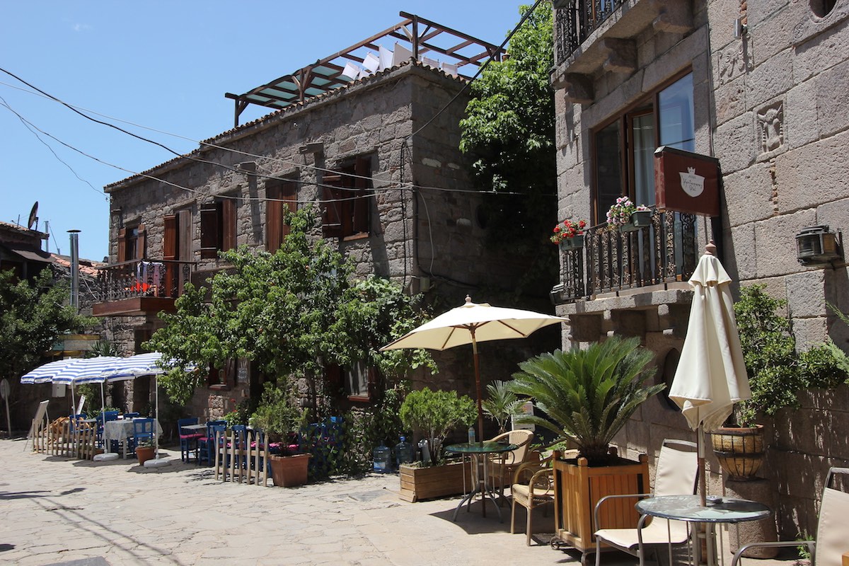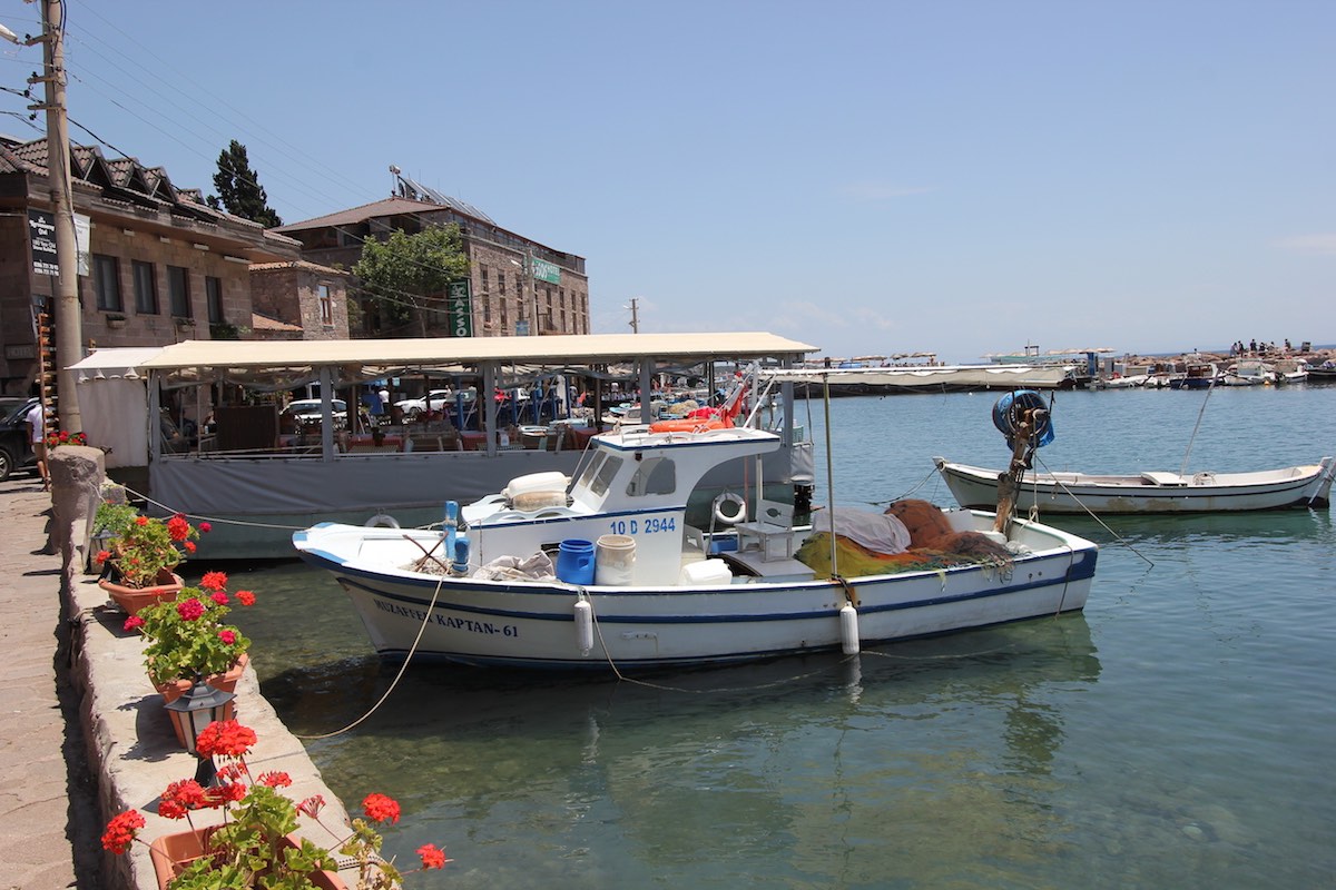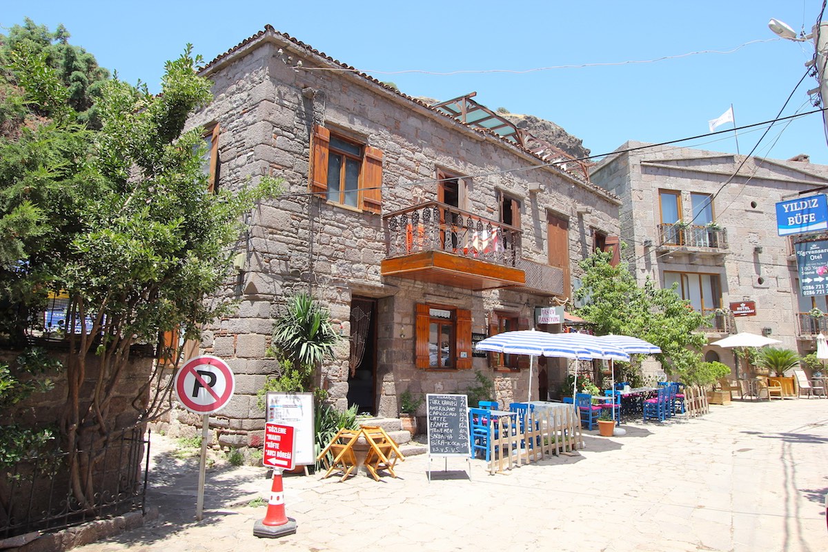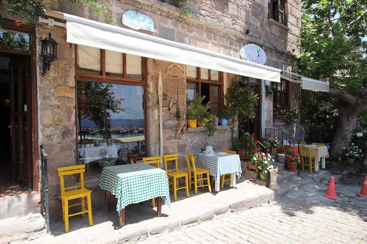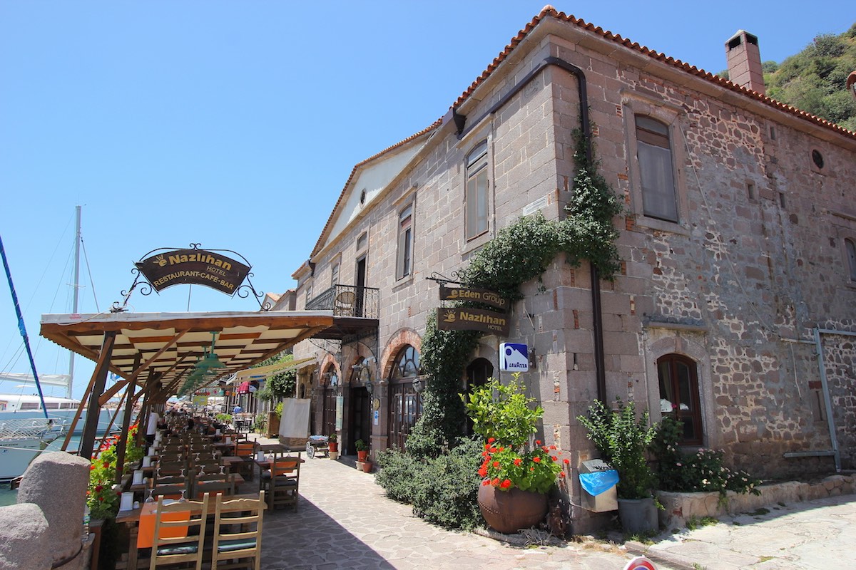 Вечерами отсюда видны огни греческого Лесбоса, и туристы, проводившие закат в храме Афины на вершине горы, охотно спускаются поужинать в порту.